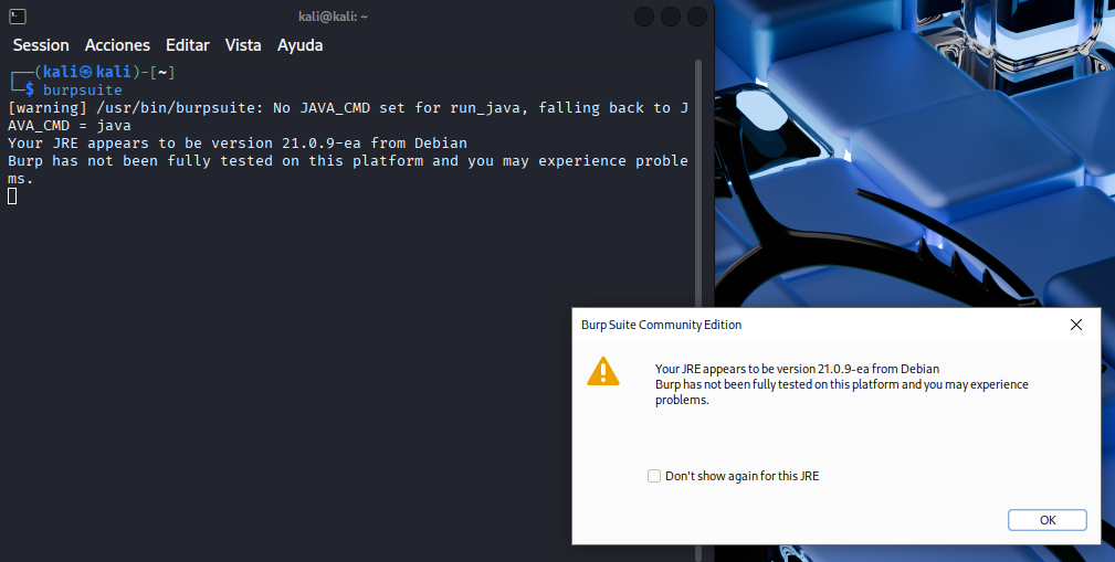 Burp Suite se ejecuta básicamente como un proxy y se puede abrir directamente desde tu máquina Kali Linux como una aplicación independiente en su versión «Community Edition» con las opciones básicas de creación de proyectos temporales, etc.