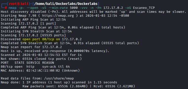 nmap -p- --open -sS --min-rate 5000 -vvv -n -Pn 172.17.0.2 -oG Escaneo