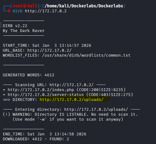 Por lo que continuamos ahora haciendo fuzzing web con dirbuster de forma rápida con el comando «dirb http://172.17.0.2» y un diccionario común por defecto, y nos encuentra el directorio /uploads.