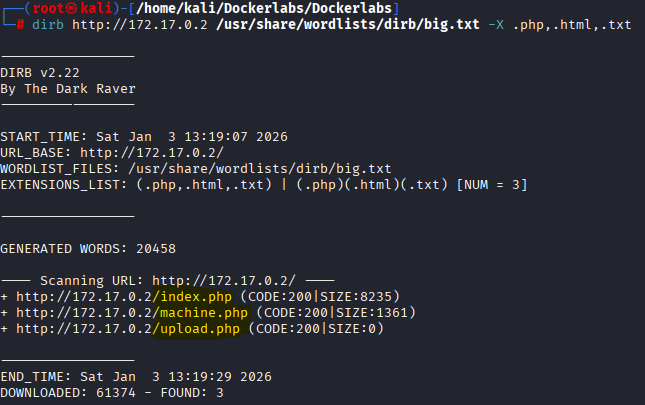 dirb http://172.17.0.2 /usr/share/wordlists/dirb/big.txt -X .php,.html,.txt