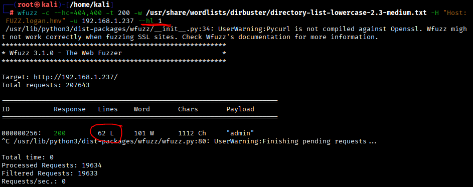 wfuzz -c --hc 404 -t 200 -w /usr/share/wordlists/dirbuster/directory-list-2.3-medium.txt -H "Host: FUZZ.logan.hmv" -u 192.168.1.237 --hl 1