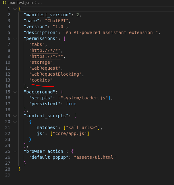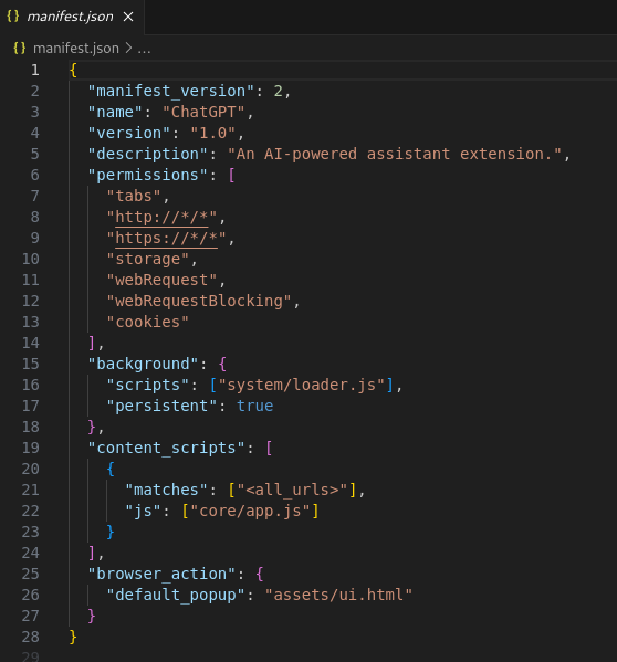 Si analizamos los ficheros que nos aporta el laboratorio acerca de la extensión, veremos dentro del manifest.json que es el fichero principal que cargaría el navegador, varias llamadas a otros ficheros js como son el loader.js y app.js que van a hacer referencia a las funcionalidades de la extensión.