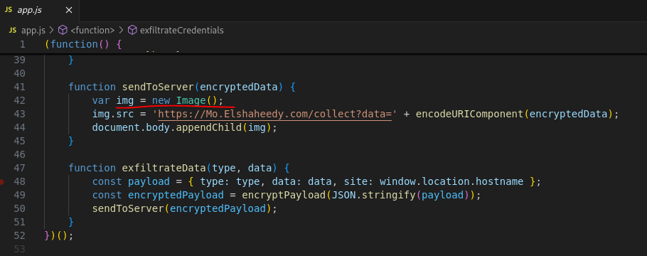 De nuevo, si analizamos ese script app.js , vemos al final de su contenido que se agrega una función que lo que hace es enviar la información recogida una vez activada la extensión, a su servidor mediante el uso de una imagen <img> que incluye la dirección de ese servidor que tiene el atacante y que además concatenará la información recogida de usuarios y contraseñas cuando el usuario se intente logar en www.facebook.com.