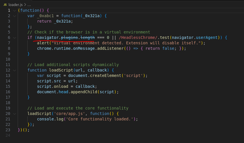 En este caso nos sirve con analizar el contenido del script loader.js y ver que en la primera línea del if para ser desactivado, se hace referencia a que si el navegador no tiene ninguna extensión activada, entonces la extensión maliciosa no correrá, por lo que sería:
