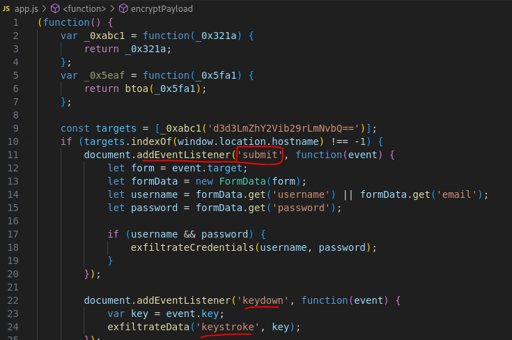 La extensión maliciosa utiliza el método addEventListener('keydown', function(event) {...}