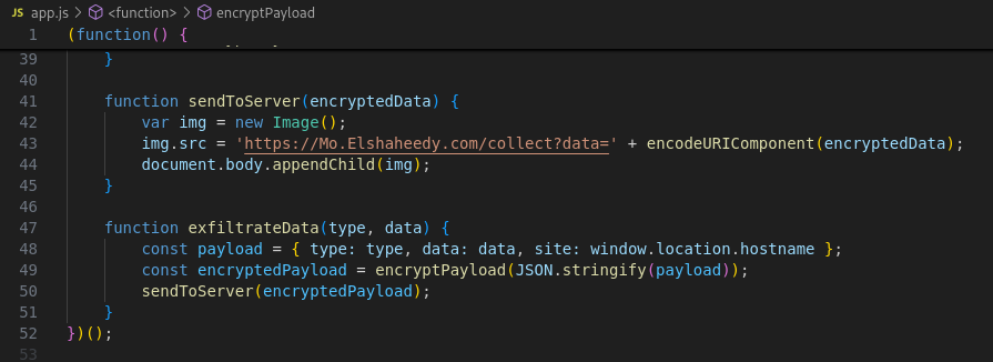 ) para exfiltrar datos robados. La URL del atacante (Mo.ElShaheedy.com