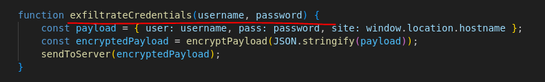 La función utilizada para filtrar las credenciales de usuario, incluyendo el nombre de usuario y la contraseña, es: exfiltrateCredentials(username, password)