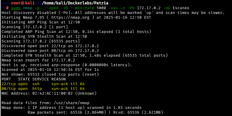 sudo nmap -p- --open -sS --min-rate 5000 -vvv -n -Pn 172.17.0.2 -oG Escaneo