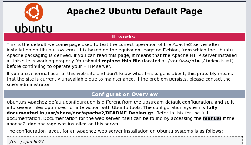 Al incluir la IP en el navegador vemos que se devuelve una página estática de una página por defecto de Apache 2 Ubuntu.
