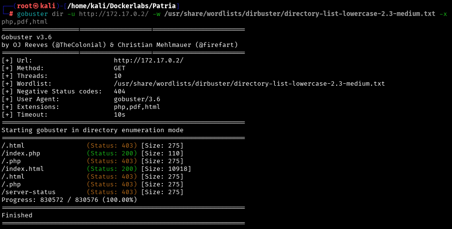 gobuster dir -u http://172.17.0.2/ -w /usr/share/wordlists/dirbuster/directory-list-lowercase-2.3-medium.txt -x php,pdf,html