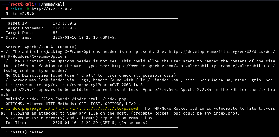 En nuestro caso, como no hemos encontrado nada más en el servidor web (Apache), con Nikto podríamos descubrir: