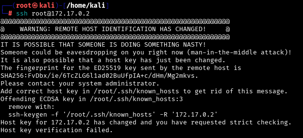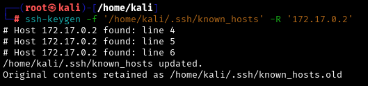 ssh-keygen -f '/home/kali/.ssh/known_hosts' -R '172.17.0.2'