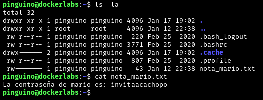 En este punto, tenemos los usuarios pinguino y mario, con las contraseñas balu y invitaacachopo , sin embargo nos falta la de root, por lo que voy a intentar conectarme como usuario mario para ver si encuentro desde ahí la pass de root…