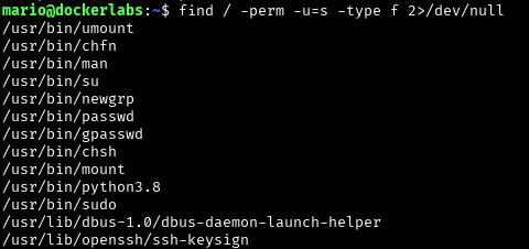 Vemos que python3.8 tiene permiso SUID activado, es decir, que si se ejecutase este binario, se podría operar con privilegios de root.