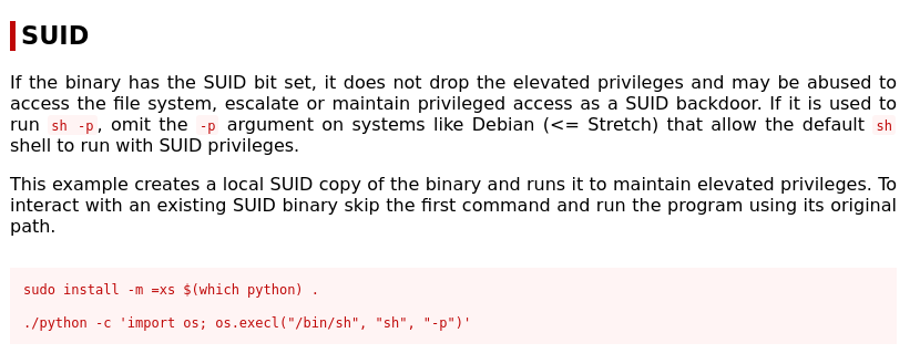 Si vamos a consultar en GTFObins las formas de cómo podemos abusar de binarios comunes como SUID en Python para escalar privilegios, nos encontramos con: