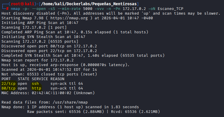 nmap -p- --open -sS --min-rate 5000 -vvv -n -Pn 172.17.0.2 -oN Escaneo_TCP