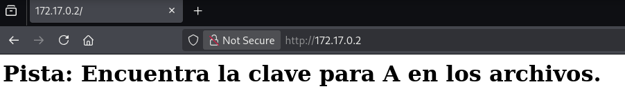 Por lo que paso a hacer un análisis del puerto 80 web introduciendo la IP en el navegador, y nos muestra ese mensaje «Pista: Encuentra la clave para A en los archivos.»: