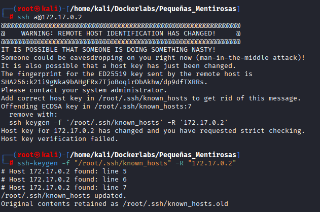 Esto es un aviso de seguridad de SSH porque la huella del servidor ha cambiado respecto a la que tienes guardada en tu Kali.
