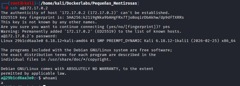 Hecho esto, y usando el usuario «a» y contraseña «secret», accedemos por ssh al servidor de la máquina como el usuario «a».