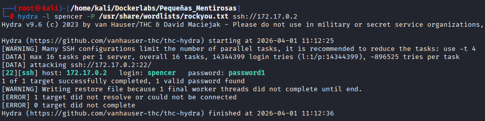 Intento pivotar a «spencer» desde el usuario «a» pero al no tener la contraseña, no puedo continuar. Sin embargo se me ocurre volver a lanzar un Hydra pero solo para el usuario «spencer» por si estuviera en ese diccionario y así intentar pivotar…