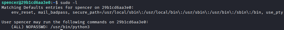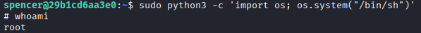 Dentro como spencer, vemos que tenemos privilegios como root sin introducir contraseña ejecutando el siguiente comando en python3.