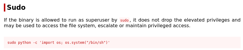 De acuerdo con el repositorio de GTFObins para el binario python, la forma de poder escalar privilegios sería ejecutando el siguiente comando como sudo pero para python3:
