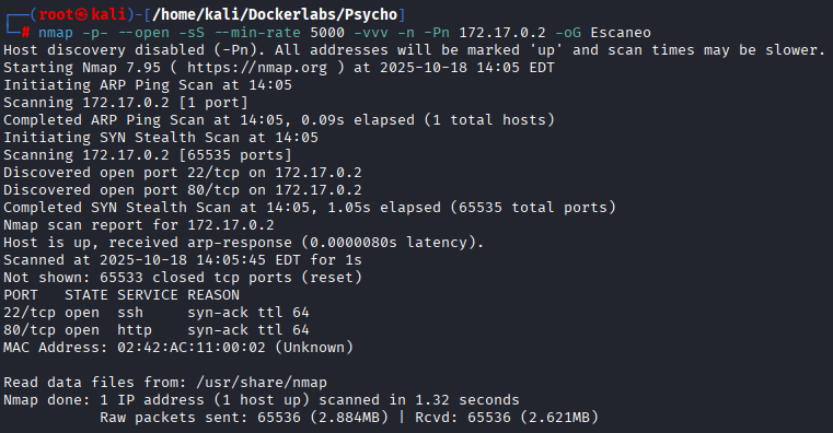nmap -p- --open -sS --min-rate 5000 -vvv -n -Pn 172.17.0.2 -oG Escaneo