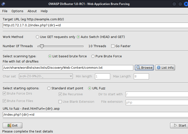 gobuster dir -u http://172.17.0.2/ -w /usr/share/seclists/Discovery/Web-Content/directory-list-2.3-medium.txt -t 30 -x php,html,txt,zip
