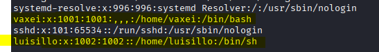 luisillo y vaxei pueden entrar al sistema (no tienen /usr/sbin/nologin) por lo que podríamos aplicarles fuerza bruta en busca de credenciales.