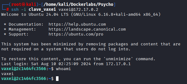 Al correr este comando, no se nos pedirá contraseña (estamos usando autenticación por clave). Debemos asegurarnos de aceptar la huella digital de la máquina la primera vez. Si todo salió bien, obtendremos una sesión SSH interactiva como el usuario vaxei: