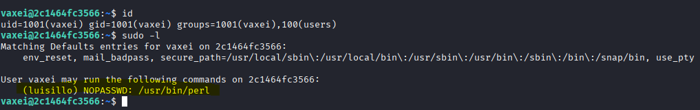 Si pasamos a ver los privilegios del usuario vaxei y ejecutamos sudo -l, vemos que vaxei puede ejecutar /usr/bin/perl como el usuario luisillo, sin necesidad de contraseña.