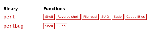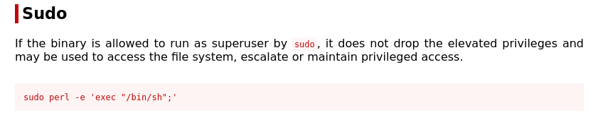 Si vamos a GTFObins que es una base de datos que muestra cómo abusar de binarios comunes para escalar privilegios, vemos que Perl puede ejecutar comandos de sistema como sudo: https://gtfobins.github.io/gtfobins/perl/#sudo