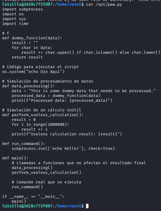 Ahora somos el usuario luisillo el cual puede ejecutar el script /opt/paw.py usando python3 como root (ALL) y sin necesidad de contraseña.