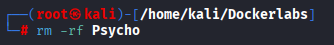 Eliminamos la carpeta de la máquina y todos sus elementos internos que alojamos durante su resolución mediante el comando rm -rf que borrará recursiva y forzadamente sin pedir confirmación: