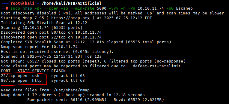 sudo nmap -p- --open -sS --min-rate 5000 -vvv -n -Pn 10.10.11.74 -oG Escaneo