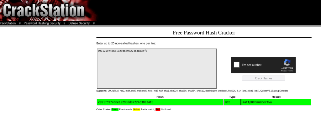Podemos a partir de aquí usar herramientas online de cracking de hashes como CrackStation uno a uno, o hacerlo a través de john the ripper pasandole un archivo ya filtrado con los hashes.