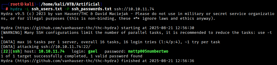 Llevándome cada uno de estos usuario a un nuevo fichero llamado ssh_users.txt y otro fichero para las contraseñas finales ya crackeadas llamado ssh_passwords.txt, le paso Hydra para ver cuál de estos es el que me permite acceder: