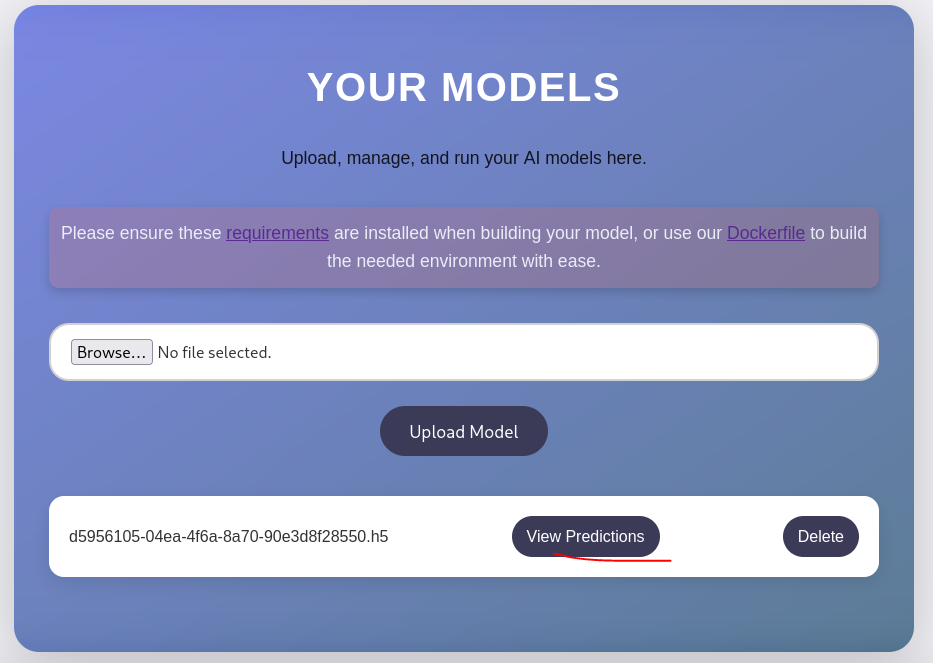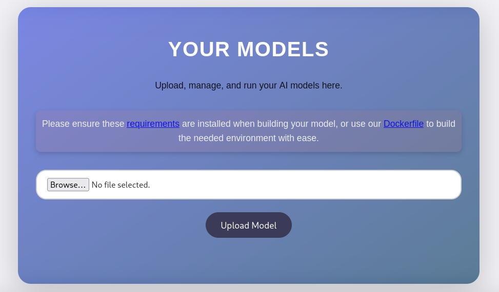 Una vez registrado, me aparece este panel donde me permiten subir mi propio modelo de IA bajo una serie de requisitos. Esto nos abre la puerta para poder probar un ataque por ejecución remota de comandos RCE, subiendo un «modelo de IA malicioso» para poder interceptarlo desde nuestra máquina atacante.