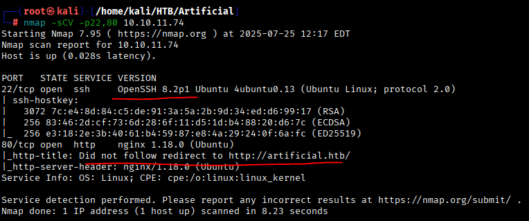 Tenemos la versión de ssh OpenSSH 8.2p1 y en el servicio web vemos que la IP no redirige al dominio de artificial.htb por lo que tendríamos que modificar el etc/hosts para ver la web.