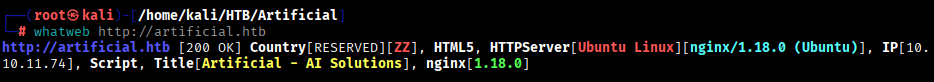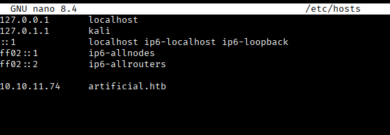 Por lo que seguimos investigando por la parte del puerto 80 http. Sabemos que la IP al introducirla en el navegador hace una redirección que no resuelve. Esto es porque no se ha añadido la IP y la dirección http://artificial.htb al archivo etc/hosts.