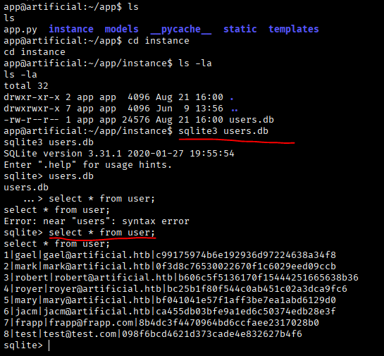 Si ejecutamos un whoami, id, hostname, vemos que somos el usuario app y si navegamos dentro entre directorios y vemos una carpeta dentro de /app llamada /instances que nos muestra un archivo users.db con una potencial base de datos de usuarios.