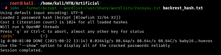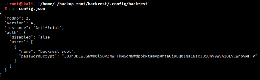 Esto nos dice que el sistema de backup/restauración usa un usuario admin llamado backrest_root. El hash es bcrypt, lo cual es más duro de crackear que MD5, pero no imposible si la contraseña es sencilla o está en algún diccionario.
