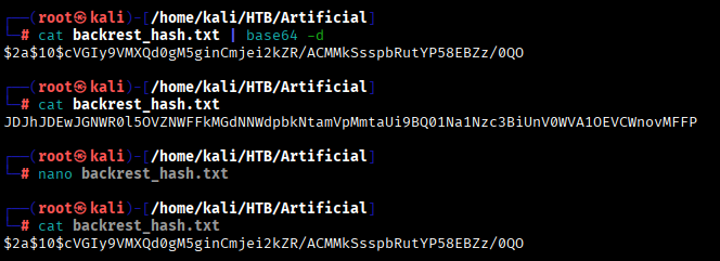 Lo que hacemos es, aislar ese hash en un txt que llamaré «backrest_hash.txt» y lo decodificaremos en base64: