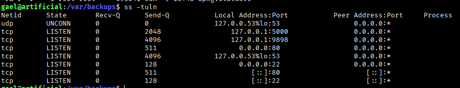 Si seguimos analizando con el usuario gael y vemos que hay servicios que están escuchando en los puertos locales como el 5000 y 9898.